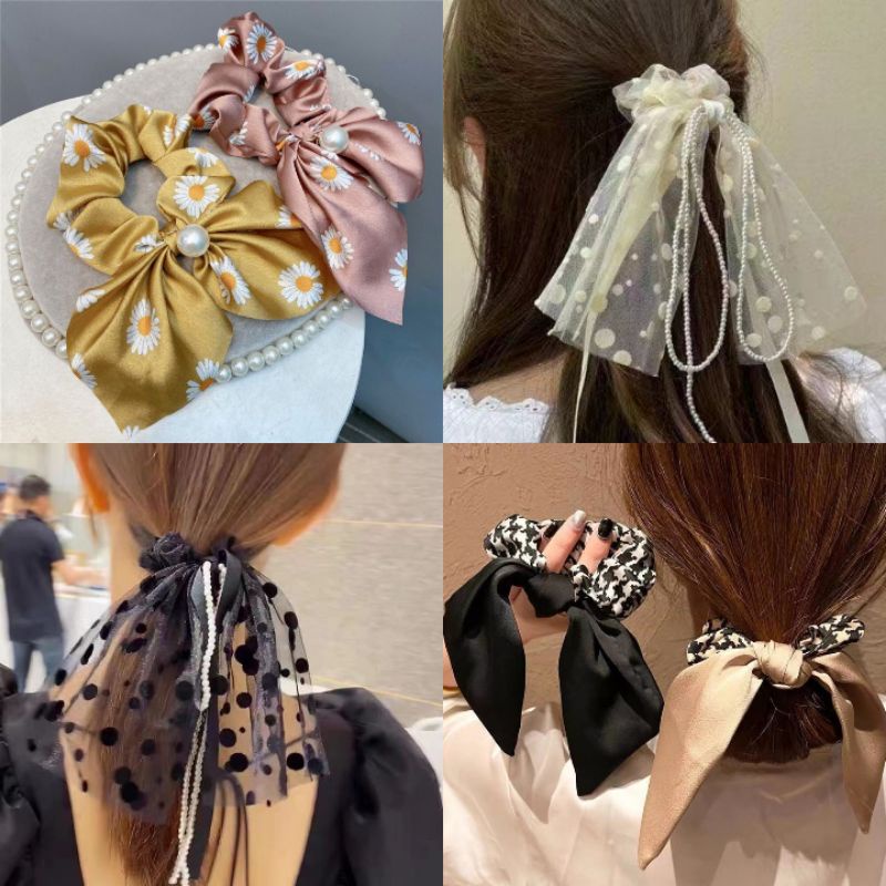 Ikat Rambut with pearl mutiara Scrunchie Daisy Satin Mutiara Silk Pony Tail